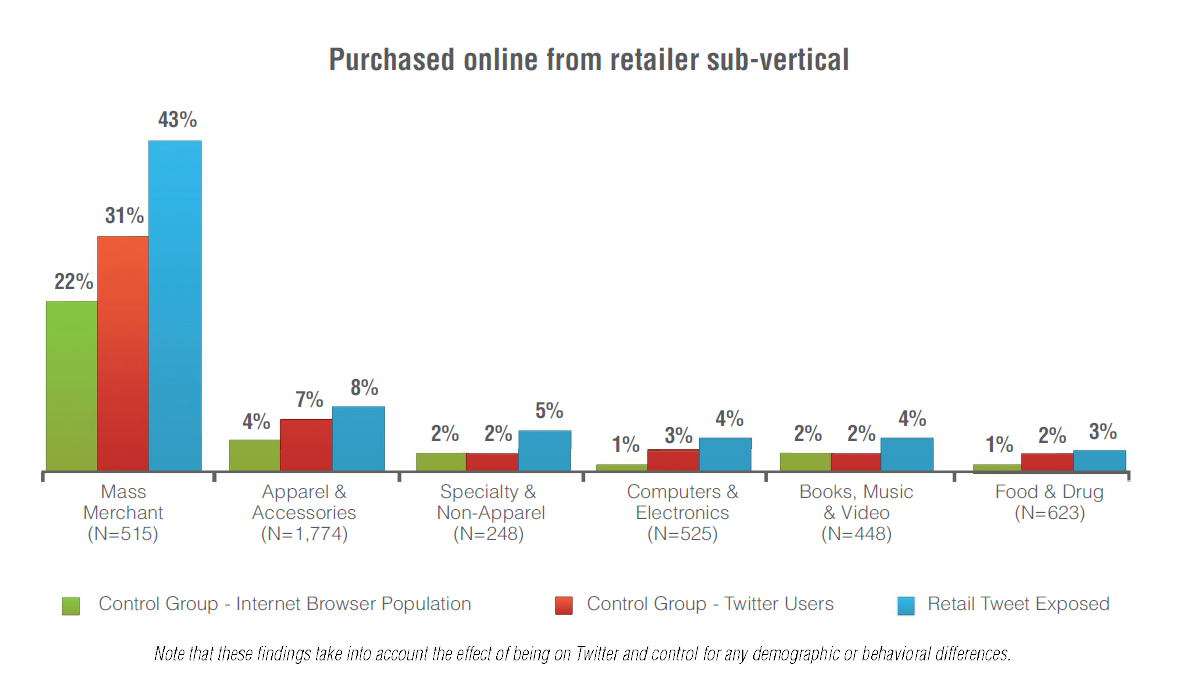 The control group comprised of heavy internet users and Twitter users and the exposed group was the one exposed to retail tweets from one of the 665 retail sites. The impact of Tweets is more pronounced on purchases as the users arrive with a higher propensity to purchase.