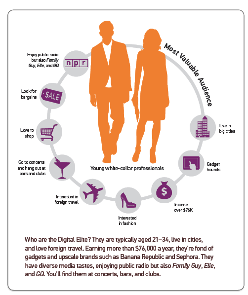 • The Digital Elite see 24 times more ads than the average consumer, putting them in such demand that marketers are willing to pay an eCPM that’s 85 percent higher than average in order to reach them.