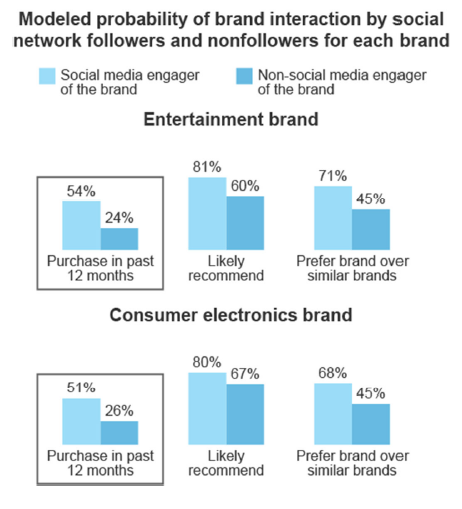 Likelihood to purchase and recommend is higher for customers who engage with Brands in one of the Social Networks.
