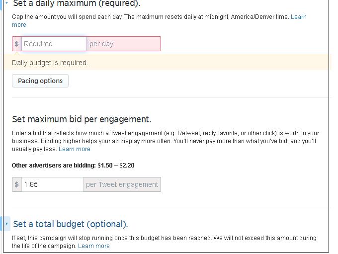 You could set up a campaign overall budget or a minimum daily bid that helps you optimize your Twitter Campaign.The campaign can be set up to deliver on Daily budget basis, Bid per Engagement or overall budget for the campaign.