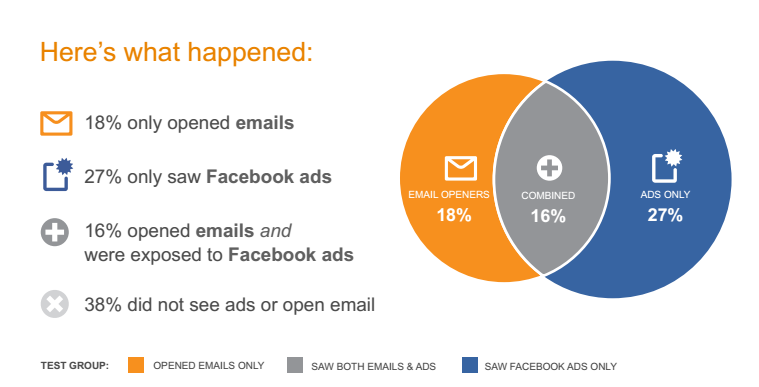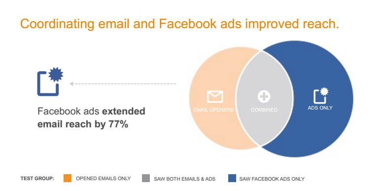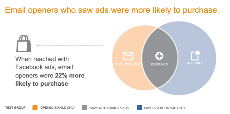 In a Case Study shared by Sales Force Marketing Cloud and Facebook, an online retail brand found that Email Marketing combined with Facebook Ads gave them better results than either standalone channel for an Online Retail Brand. Combination of Channels is effective when there is a large segment being exposed to messaging in two different channels for greater reach . Email alone created a greater intent to purchase whereas Facebook gave incremental reach of 77 %.