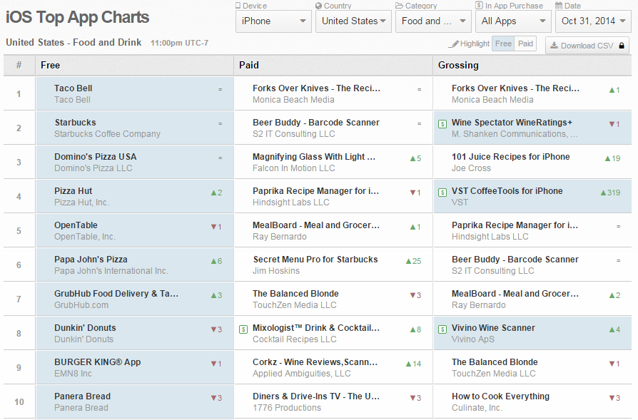The Top Ten Apps on iPhones for US in Food and Drink Category
