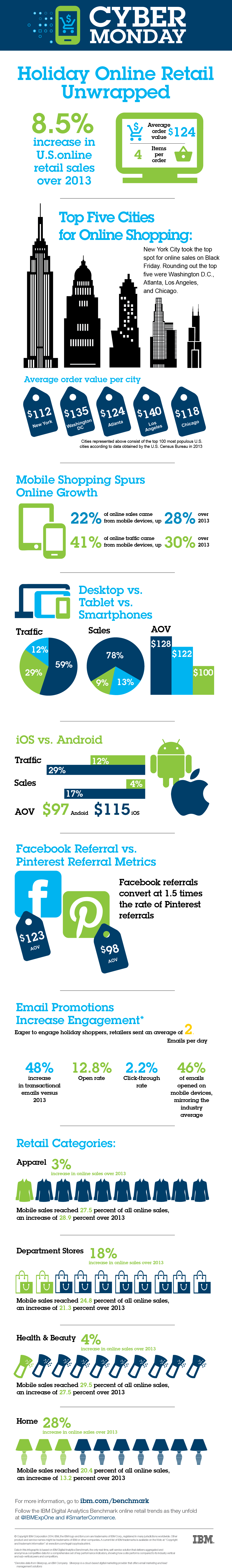Cyber Monday Becomes Mobile Monday: Cyber Monday mobile traffic accounted for 41.2 percent of all online traffic, up 30.1 percent over 2013. Mobile sales were also strong, reaching 22 percent of total Cyber Monday online sales, an increase of 27.6 percent year-over-year.