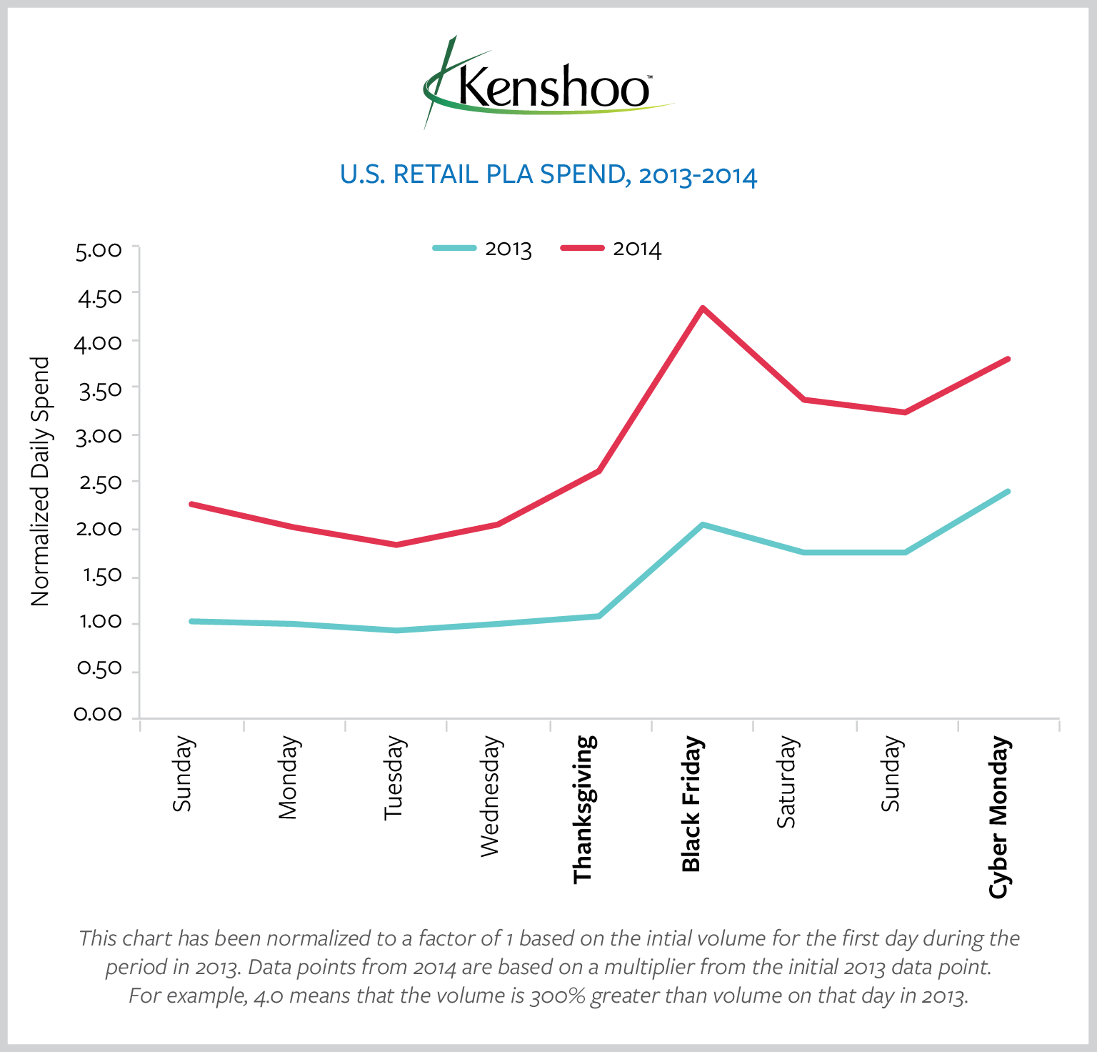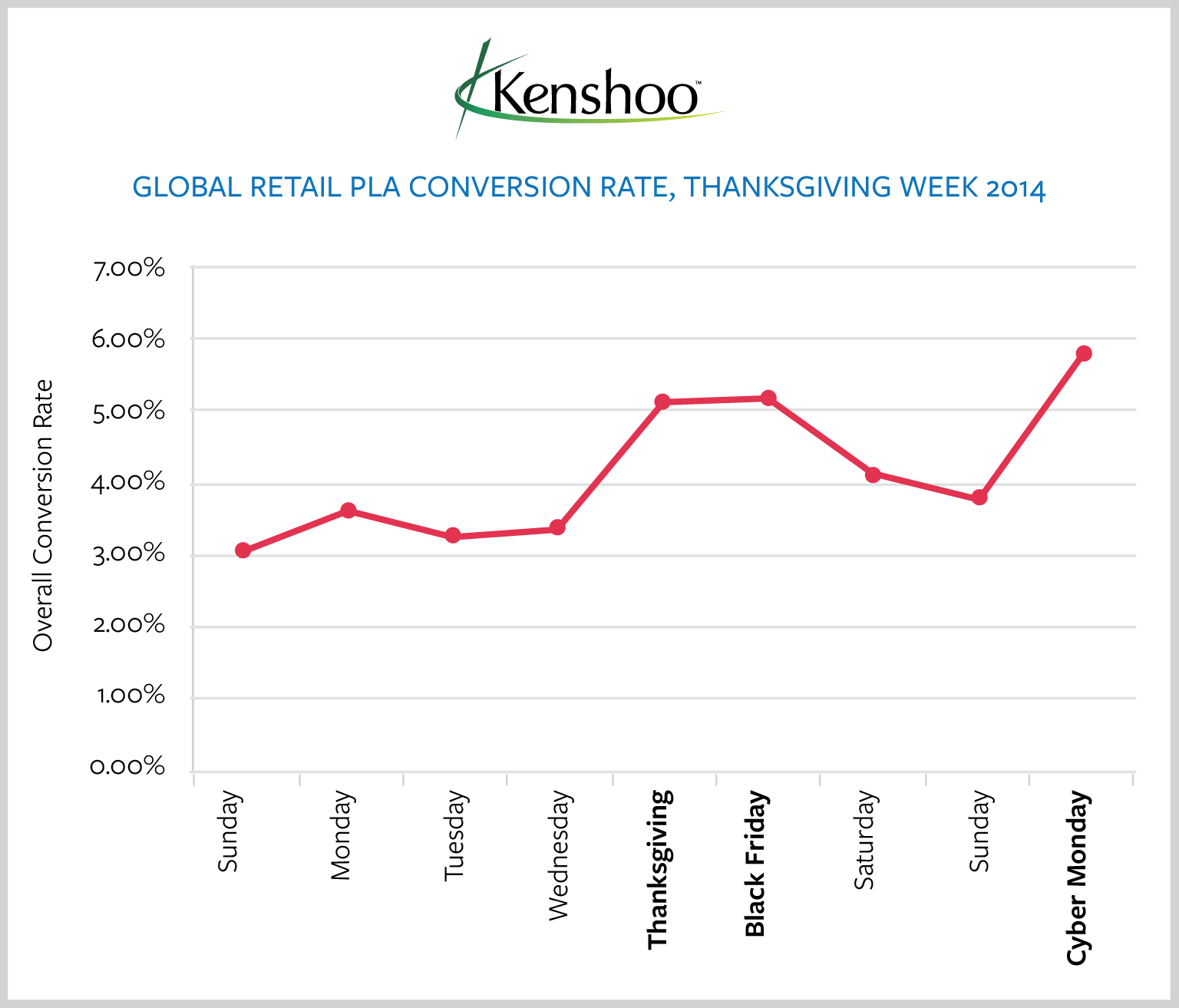 As reported by Kenshoo Google Shopping Campaigns increased spend was highest on Thanksgiving an increase of 143 percent, followed by Black Friday an increase of 113 percent, and finally Cyber Monday an increase of 59 percent.