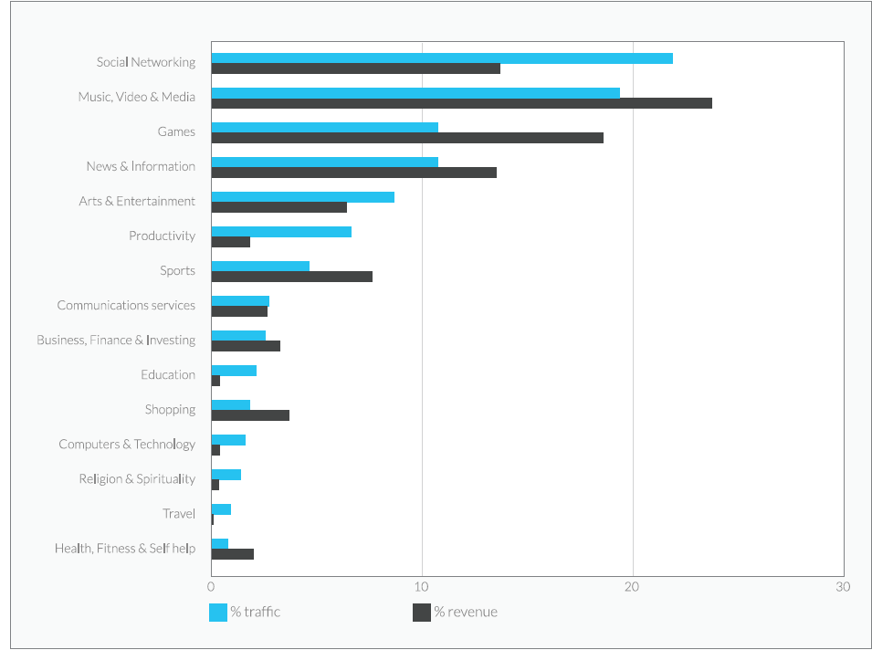 According to a study SMA by Opera Mediaworks, iOS devices contribute to over 50 percent of Mobile Advertising Revenue and Android is the leading traffic generator at 57 percent. Social Networking as the leading vertical for Traffic generation with largest number of ad impressions and Music, Entertainment is the highest revenue generator. Health and fitness is notable for its traffic to revenue generations with revenue contribution at almost 2X of the impressions..