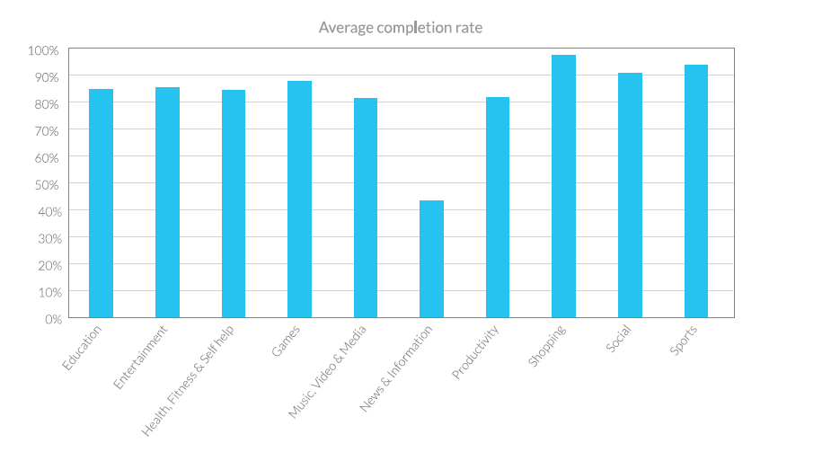 Video Ad Completion rates for In-apps advertising is highest for shopping, sports, social and health and fitness.