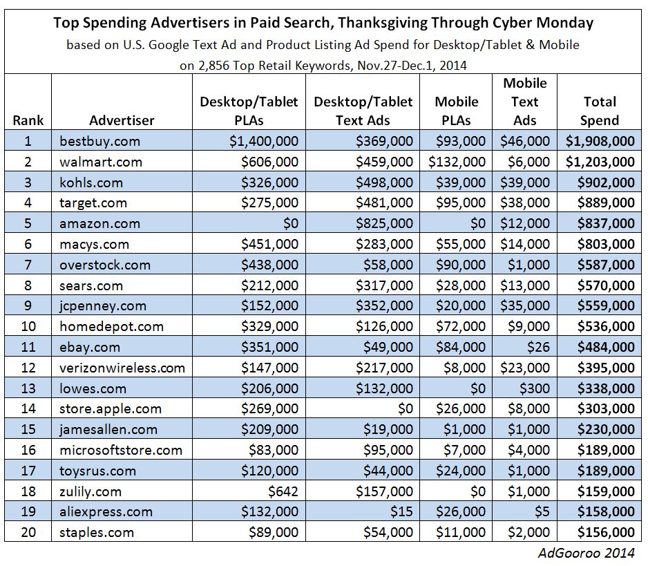 Best Buy has a particularly strong Product Listing Ad (PLA) program, which has put it ahead of its competition in Consumer Electronics and general paid search advertisers as well. Best Buy topped the ranking with USD 1.9 million in Paid Search spend, including USD 1.4 million devoted to Shopping Campaigns. The other sites that were enlisted as the Top spenders by AdGooroo are Walmart ($1.2 million), Kohl’s ($902,000), Target ($889,000) and Amazon ($837,000) rounded out the Top 5 positions.