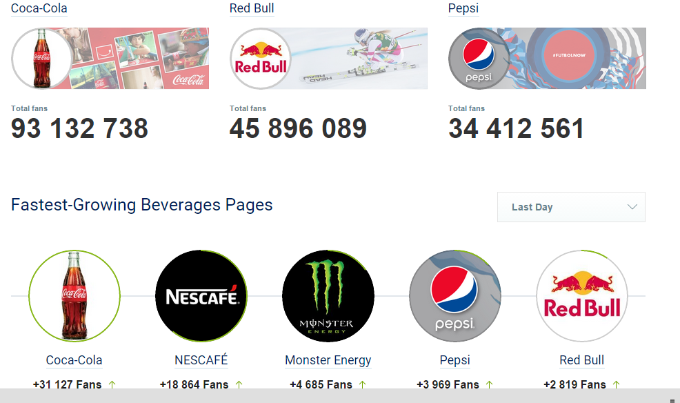 Red Bull with a large Fan base is one of the leading beverages adding fans to Facebook. Among other brands that are gaining popularity in social media are Nescafe and Monster Energy.
