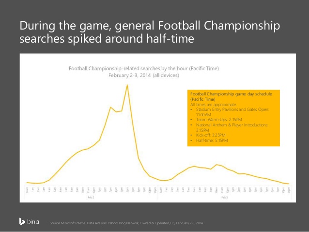 It is important to note that during the searches peaked during the half-time. Make sure your campaign is optimized for the half-time searches during the game.
