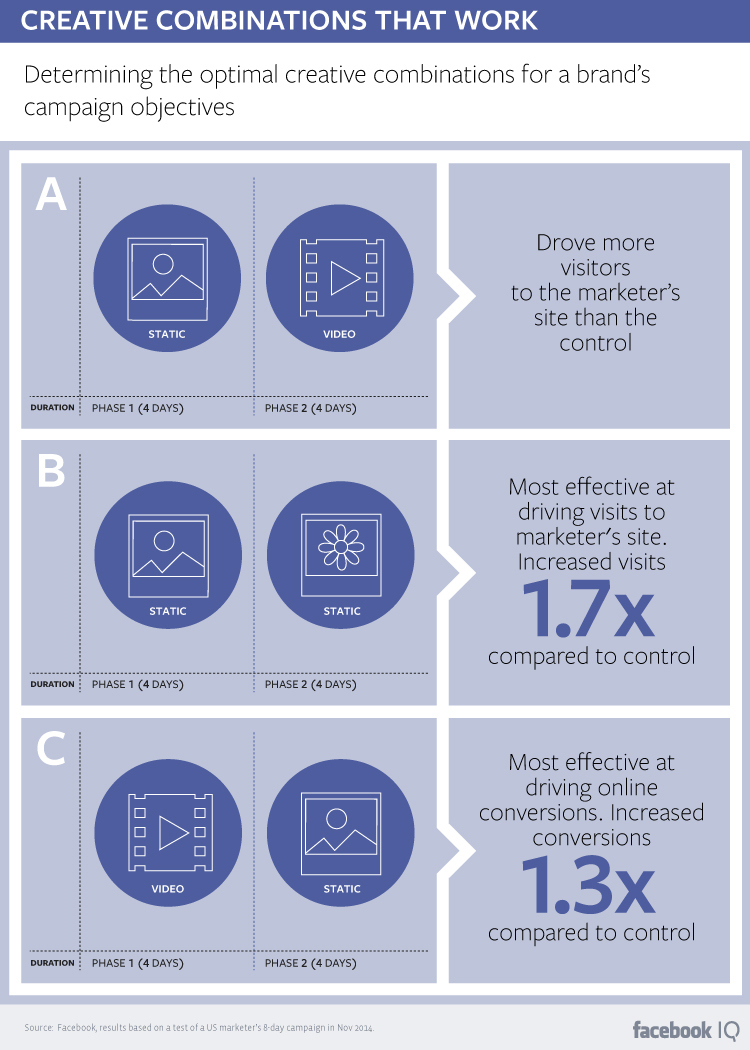 A test run by an advertiser on Facebook comparing three sequencing strategies in Nov 2014, held over two four-day phases across both desktop and mobile News Feed in the US, helped arrive at an approach that seems to work best for combining creative while advertising on Facebook.