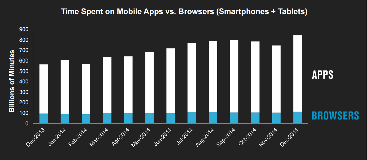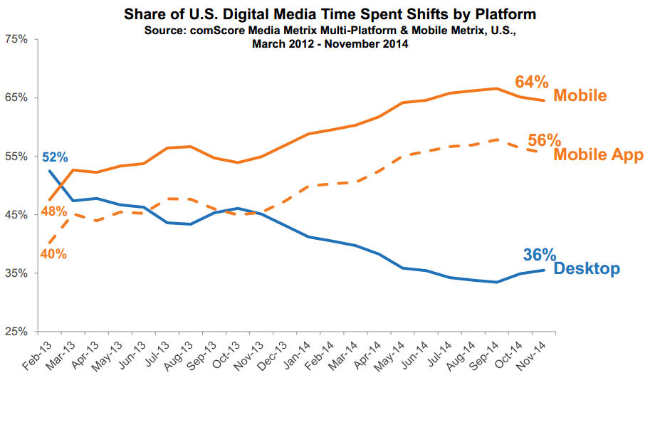 Time spent on Mobile Apps has continued to grow in 2014 with Messaging Apps along with Social media being the third highest growth category. Considering the level of engagement with Messaging Apps is high, Brands looking at creating newer digital experience could use this as an opportunity to create buzz for digital events as the opportunity for real-time engagement with Video and Photos is greater.