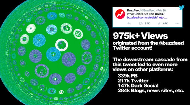 The cascade effect from the BuzzFeed post for The Dress, as analyzed started with a Tweet and cascaded downstream on other social media channels with only a quarter of views originating from Twitter.