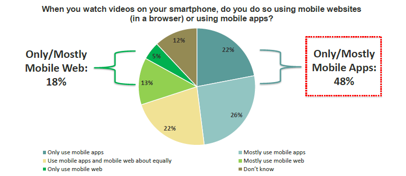 Apps were seen as the preferred way to access the video content primarily because of the stable unobtrusive viewing with 48 percent audience preferring to watch mobile video only on apps.