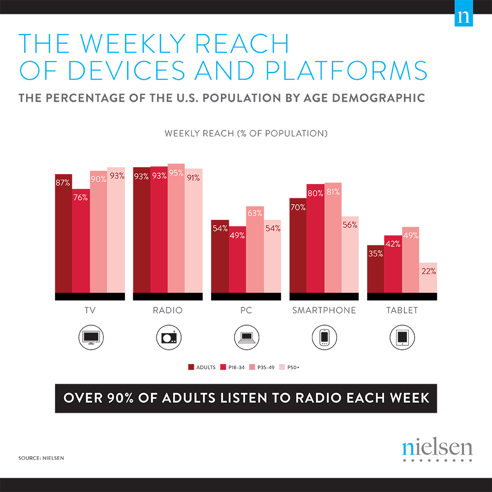 According to a Nielsen report, digital devices, smartphones actually had the greatest weekly reach at over 167 million or 70 percent of all U.S.