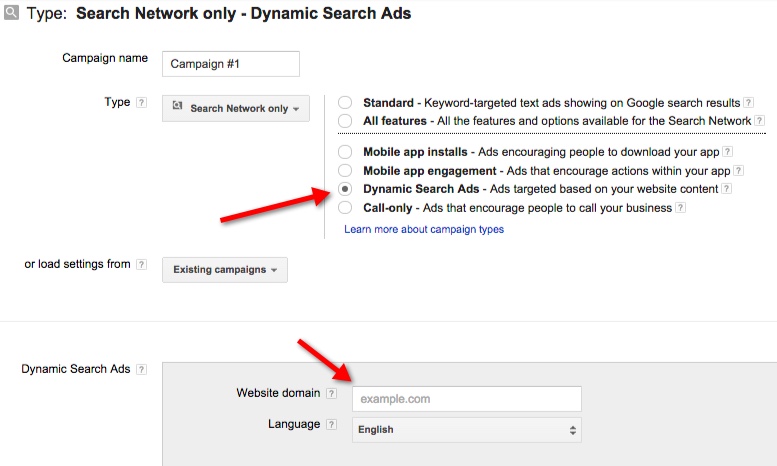 - Select campaign Type: Search Network only – Dynamic Search Ads.