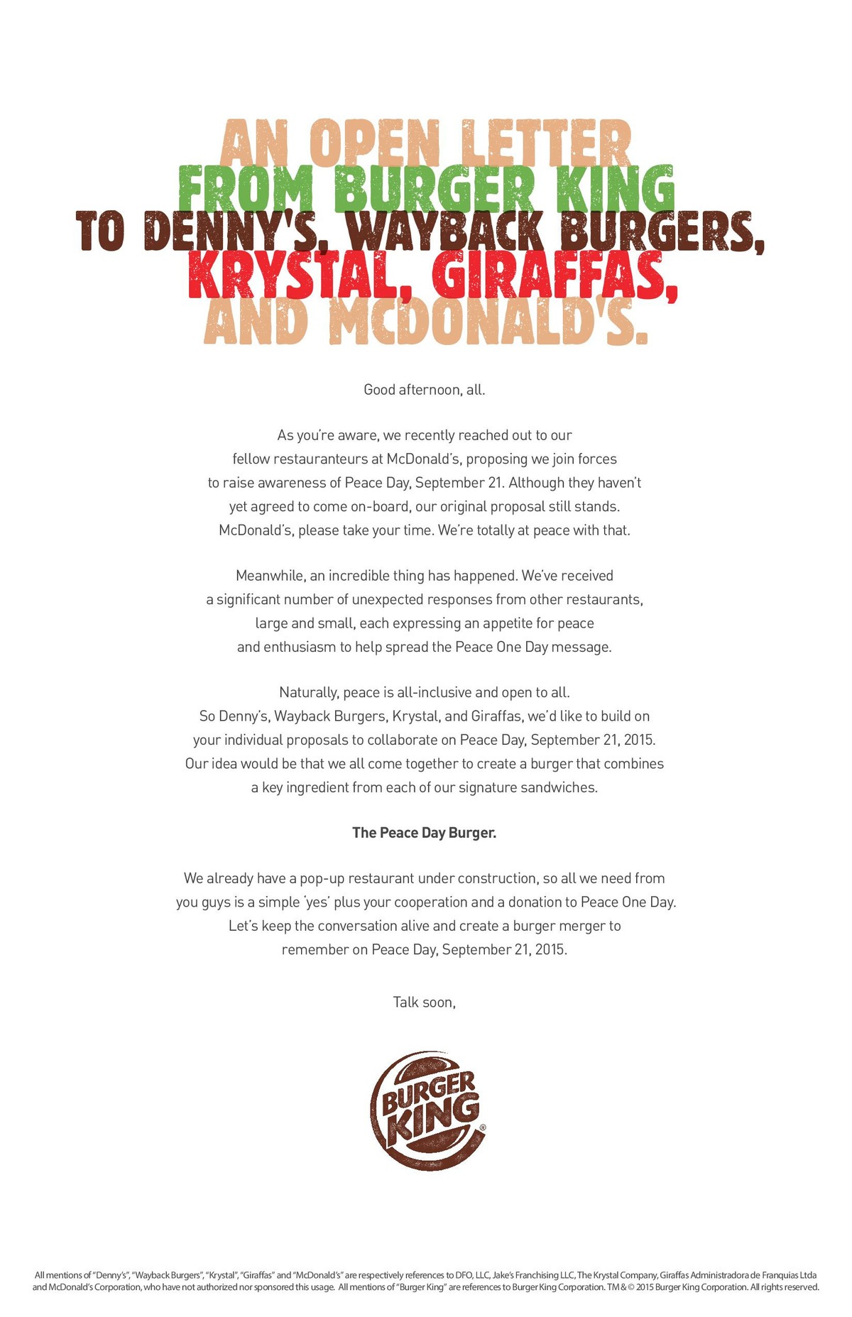 Denny’s, Wayback Burgers, Krystal, and Giraffas, we’d like to build on your individual proposals to collaborate on Peace Day, September 21, 2015. Our idea would be that we all come together to create a burger that combines a key ingredient from each of our signature sandwiches.