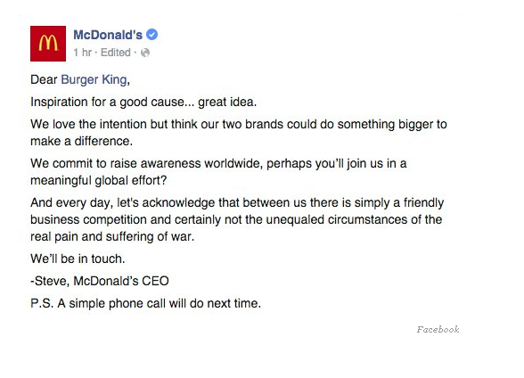 According to Mashable, “The letter says the proposition to McDonald’s still stands. If McDonald’s wants to join the party, the company is more than welcome, despite the CEO’s sarcastic retort”.