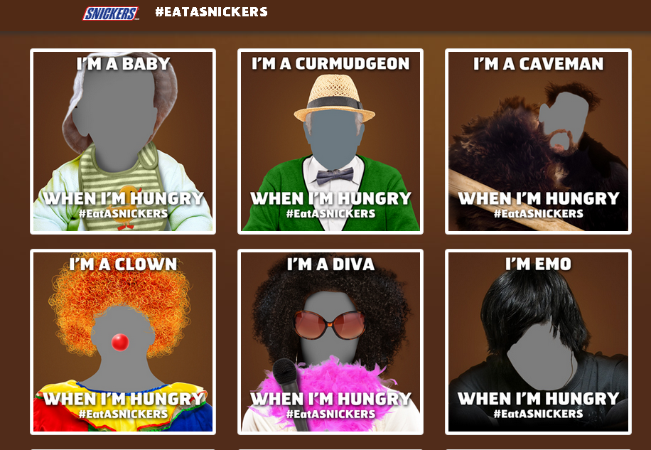 Snickers engaged audiences with an interactive campaign that encouraged audiences to use a Meme generator , to identify their personas when they are hungry. The social media campaign took the positioning of the brand “Snickers satisfies” further with the #EatASnickers.