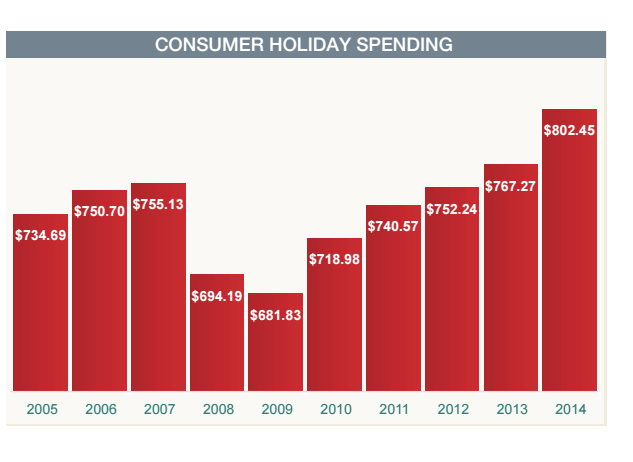 National Retail Foundation is projecting 2015 holiday sales to rise 3.7 percent, reaching USD 630.5 Billion dollars, of which USD 105 Billion Dollars is going to be online sales. Retailers report seeing more than 20 percent of sales being generated in the last 61 Days with Jewelry stores stating as high as 26 percent of the sales are generated during the holiday season. On average Holiday Shopping has seen an upward trend, with Holiday shoppers in 2014 spending an average of USD 802 on gifts, decorations, food and more, compared to USD 767 spent in 2013. Mobile sales reached a new high of 27 percent of online retail sales.