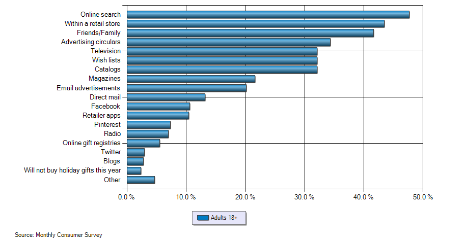 Most customers get their information and inspiration about offers across channels, and therefore retailers seeking to give offers prior to the prime-shopping days, should look at sequencing the deals and offers to target the different audience segments. Online search was the most important source of Gift Inspiration for Shoppers in 2014.