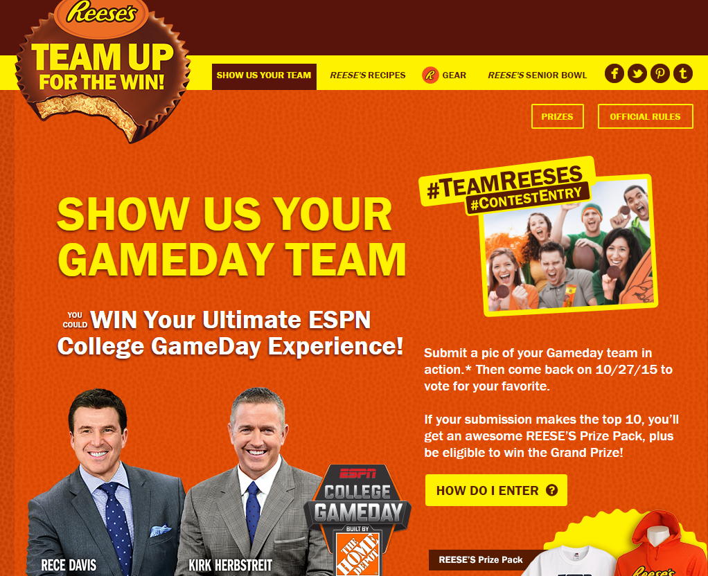 Design your contest to create a desire with your targeted audience, with a reward that they are most likely to cherish and at the same time posts with content that they find engaging. Reese’s has created a series of Game Day Celebrations titled, Reese’s Gameday Greatness, with video features that give a true feel for some of the oldest college rituals and see the passion and excitement surrounding game days.