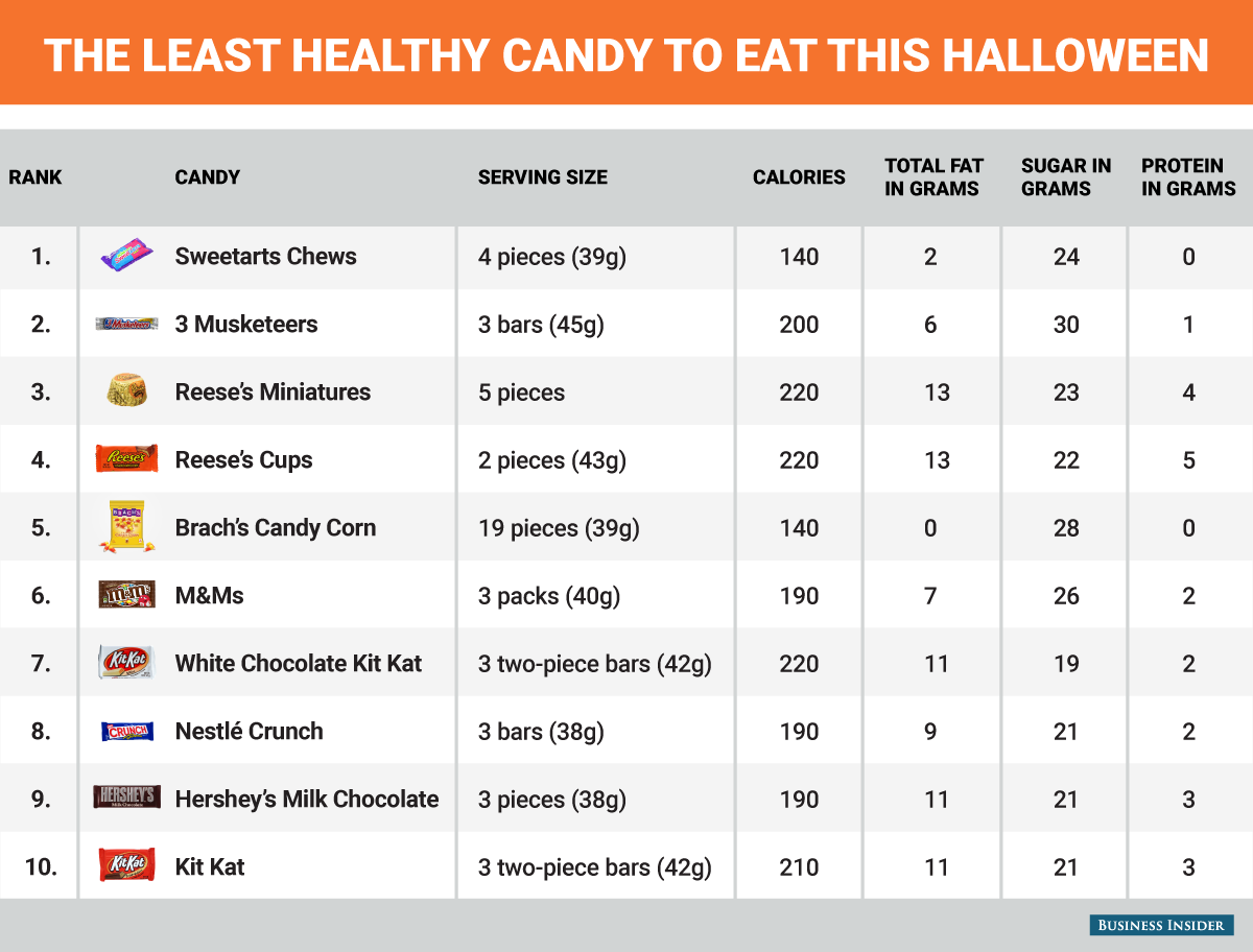 Another post from Business Insider gives the healthiest and the least healthy candies to eat this Halloween with nutrition facts, including fat and protein content and Calories.