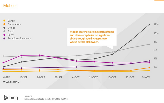 Product posts for Halloween, can serve to remind your engaged audiences about special products that are available for Halloween. Most audiences engage across Social Media and search. With search queries being the highest in the middle of October and with excitement continuing till the end of the month, posts reminding audiences about your product with new packaging or messaging can serve as a reminder. Planning a search campaign for Food and Beverages category can increase sales with Click through rate for the category being as high as 12 percent in the two weeks before Halloween.
