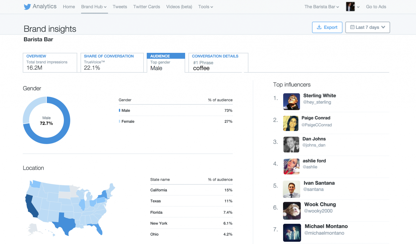 With Brand Hub Marketers can gain insights for, the location where your audiences are engaging the most with your Tweets, guiding you through Campaign Planning.