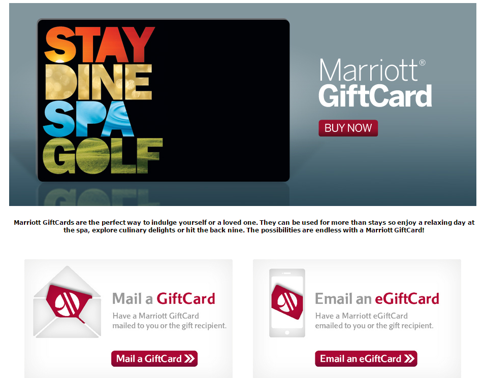 Marriott Rewards site has a Gift cards section that allows users yo email an eGiftcard that promises possibilities of endless opportunities that can be enjoyed for Hotel Stays, Dining, Golf and other Luxury treats.