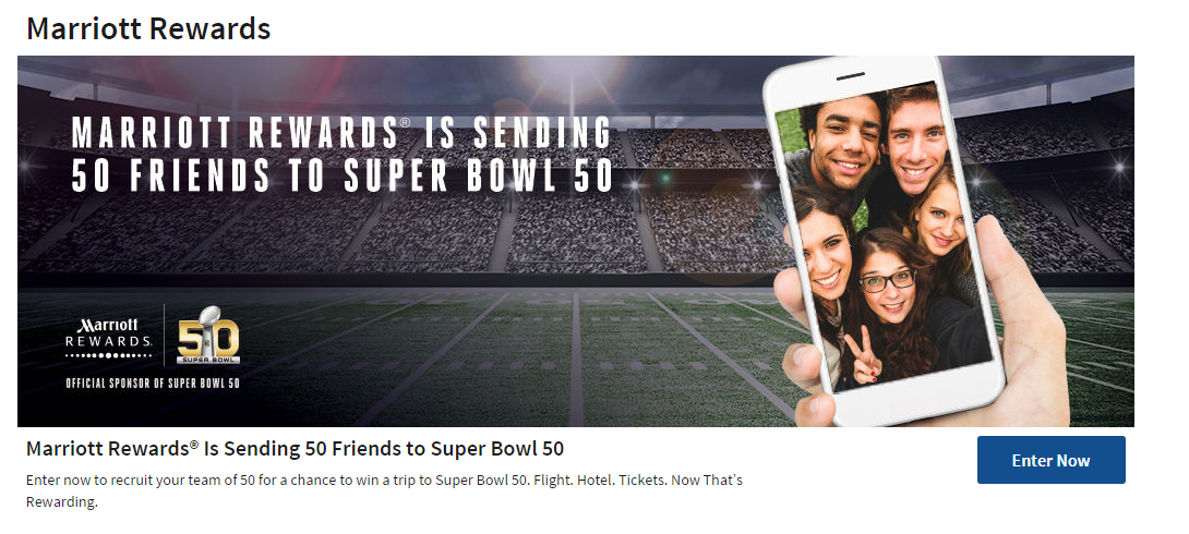 Brands that announce the offers and promotions on the site are not only seen as rewarding but often generate a phenomenon of “Flocking” where users visit the site to see the next deal or offer. The content that audiences view often leads to shares and generating a word-of-mouth for contests and offers. Marriott Rewards allows users to list up to 50 friends for Super Bowl 50, for a chance to win a trip with Flight, Hotel and tickets paid for.