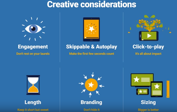 Click-to-play demands an initial frame that is compelling; an interesting image gets a much better click rate than a brand logo. With skippable YouTube ads, the first five seconds create maximum impact: after that, viewing drops to below half. To retain viewers, Skippable ads must offer something impactful in the first few seconds.