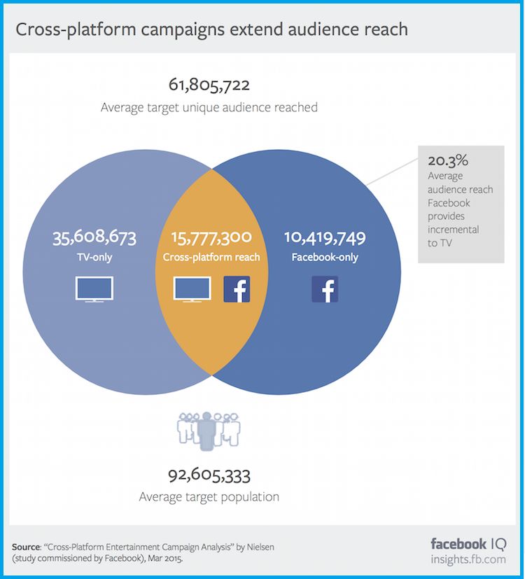 Facebook provides incremental reach over TV as per Nielsen’s research, where entertainment marketer who used Facebook to complement TV extended audience reach, by over 20 percent.