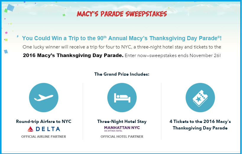 Macy’s Thanksgiving Day Parade engagement on Digital with a Sweepstakes and a chance to be at Thanksgiving Day parade features Parade Day shorts and games. The microsite enlivens the parade digitally, where users can download an exclusive Thanksgiving Day Parade App and view the conversation surrounding the event.