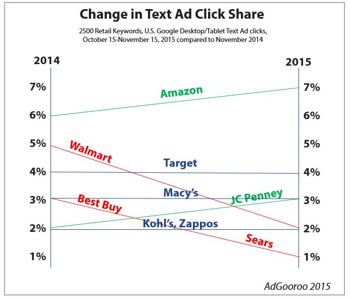 PLAs space is less crowded with five retailers leading click-share of advertising. Walmart and Target both led with a 7 percent click share. Walmart increased its click share from 6 percent in November 2014 while Target increased its click share from 5 percent last year. eBay also increased its click share, from 2 percent in 2014 to 3 percent this year.