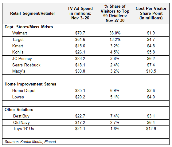 An analysis from Kantar Media for 2014 ad spend, with a syndicated research carried out by Placed with an opt-in panel of smartphone-enabled consumers to track their locations and the retail stores they visited from Thanksgiving Day through the following Sunday.For in-store shopping Walmart was seen as the most efficient advertiser with the least Cost Per Visitor.