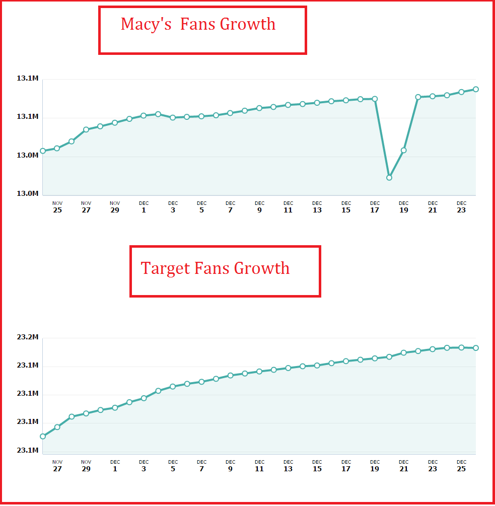 The most engaging Walmart’s Facebook Video post was about the power of giving. The post generated highest number of Facebook Social media actions. Macy’s Social Media Strategy engaging fans with “Make-A-Wish” campaign and Target’s strategy focused on deals delivered on Facebook Fans growth.