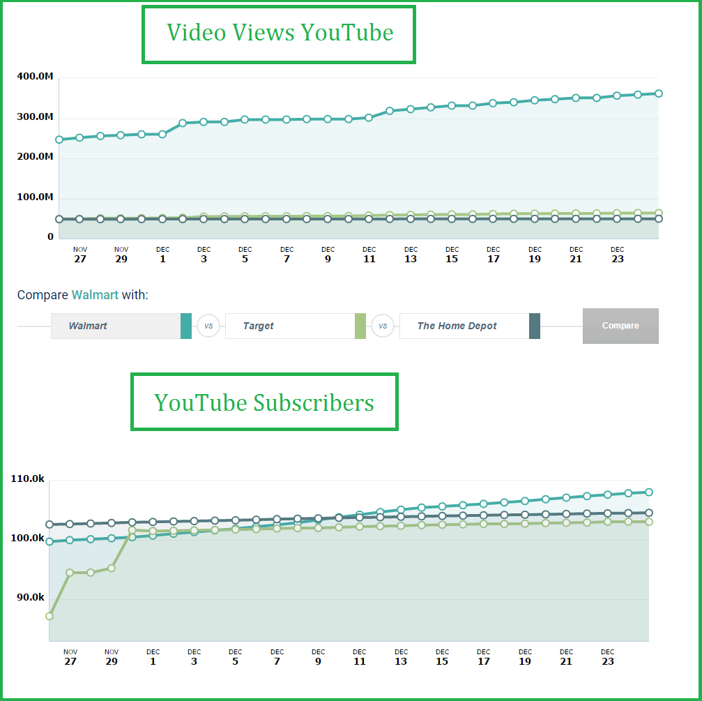 According to Social Bakers for the retail category, for the US market, Kohl’s YouTube strategy with a Holiday Campaign saw an increase in YouTube subscriber growth, with a rise in video views with a Holiday themed campaign. Walmart, Target and The Home Depot saw a similar increase in YouTube subscribers. Walmart with a retailtainment approach released a series of Holiday themed videos that engaged audiences with musical scores. Target followed a storytelling approach that required audiences to follow an adventure themed video series. The adventures series was coupled with product hauls and deal forecasts for viewer engagement.