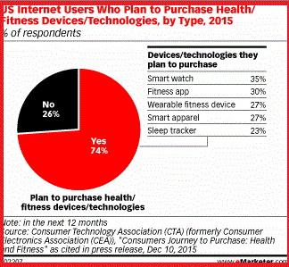 More than one-third of that group said they plan to buy a smart watch and 30 percent said they intend to purchase fitness apps in the next 12 months. Nearly 27 percent of health and fitness device buyers said they expect to buy wearable fitness devices, and the same percentage said they plan to purchase smart apparel.