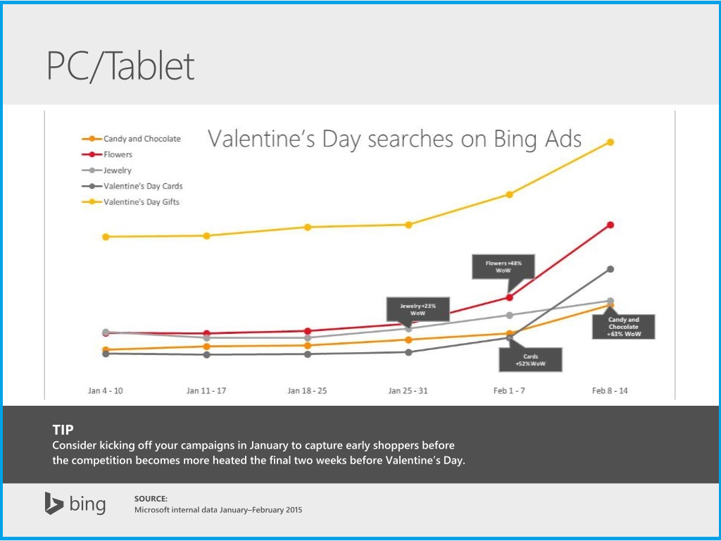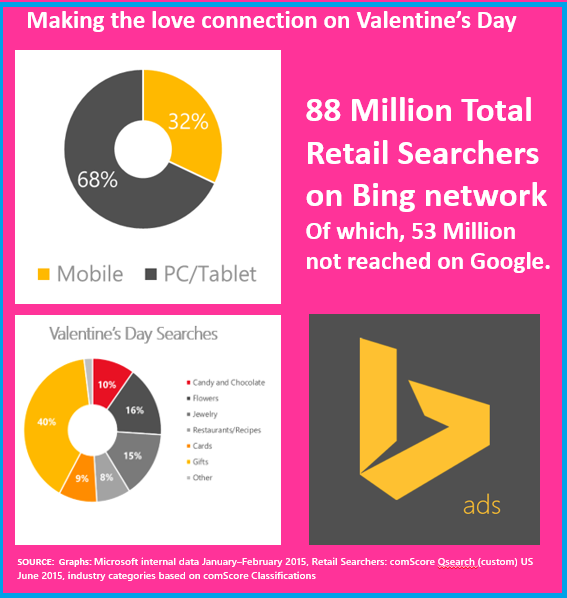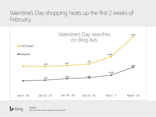 Bing Ads that reaches 53 M additional searchers for Valentine Day’s gifts for retail category, has shared specific insights that let you target audience for devices and time of day they are most likely to be searching for your products. Mobile makes for 32 percent of searches in the category.