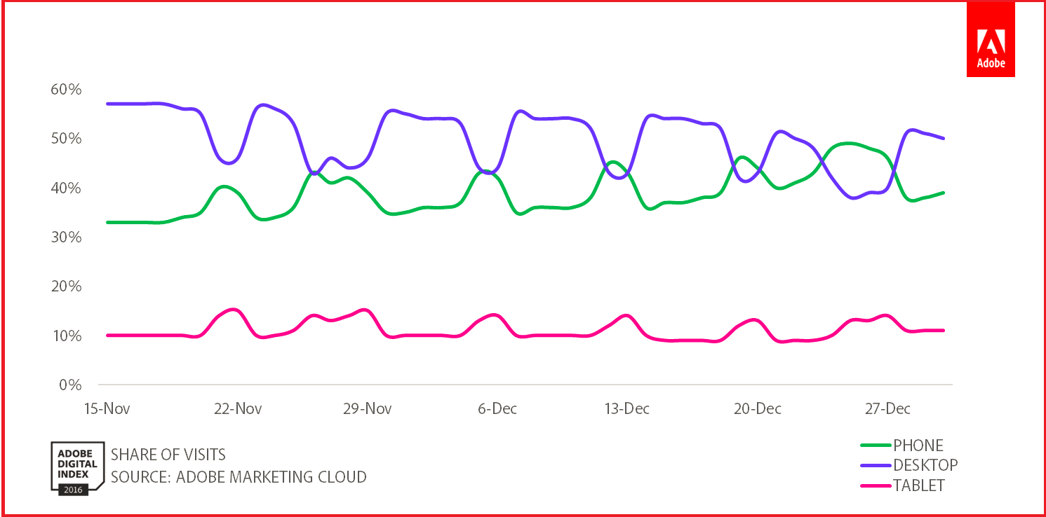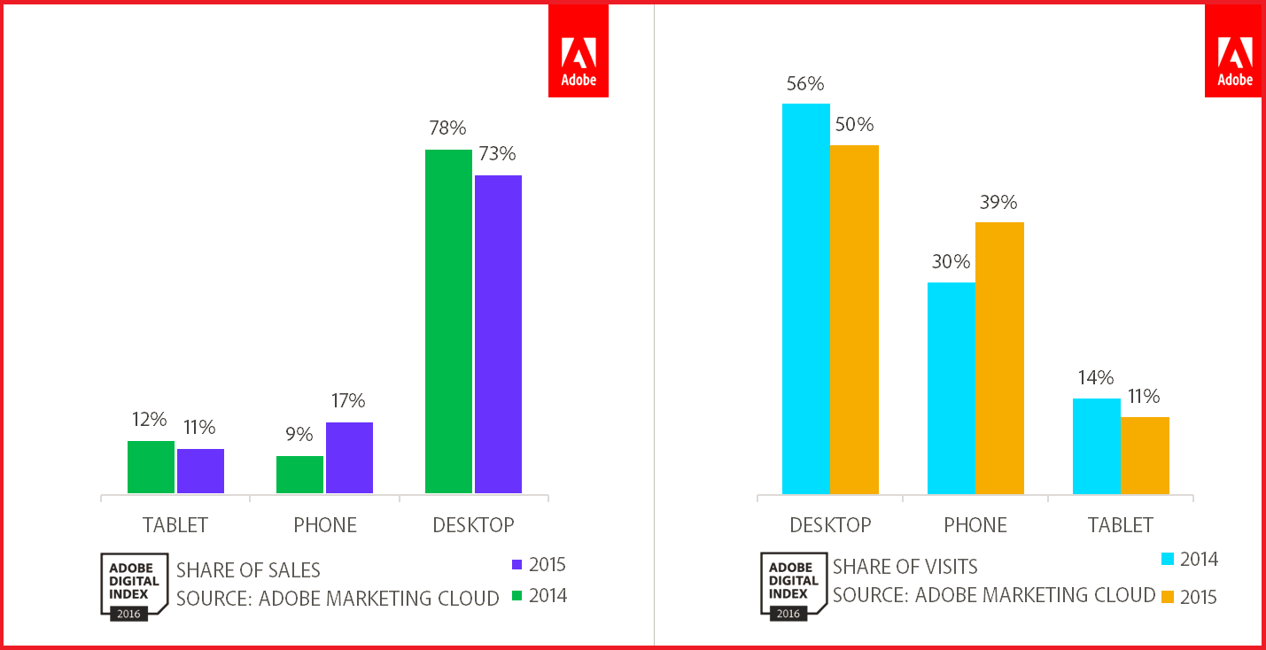 Mobile Phones were at 39 percent of visits and 17 percent of sales during holiday 2015, which is more than the share of sales and traffic driven by tablets. However, share of sales from tablets at 44 percent from mobile devices in comparison with share of visits at 24 percent reveals a higher conversion rate for tablet users.