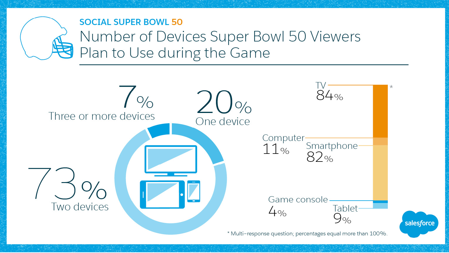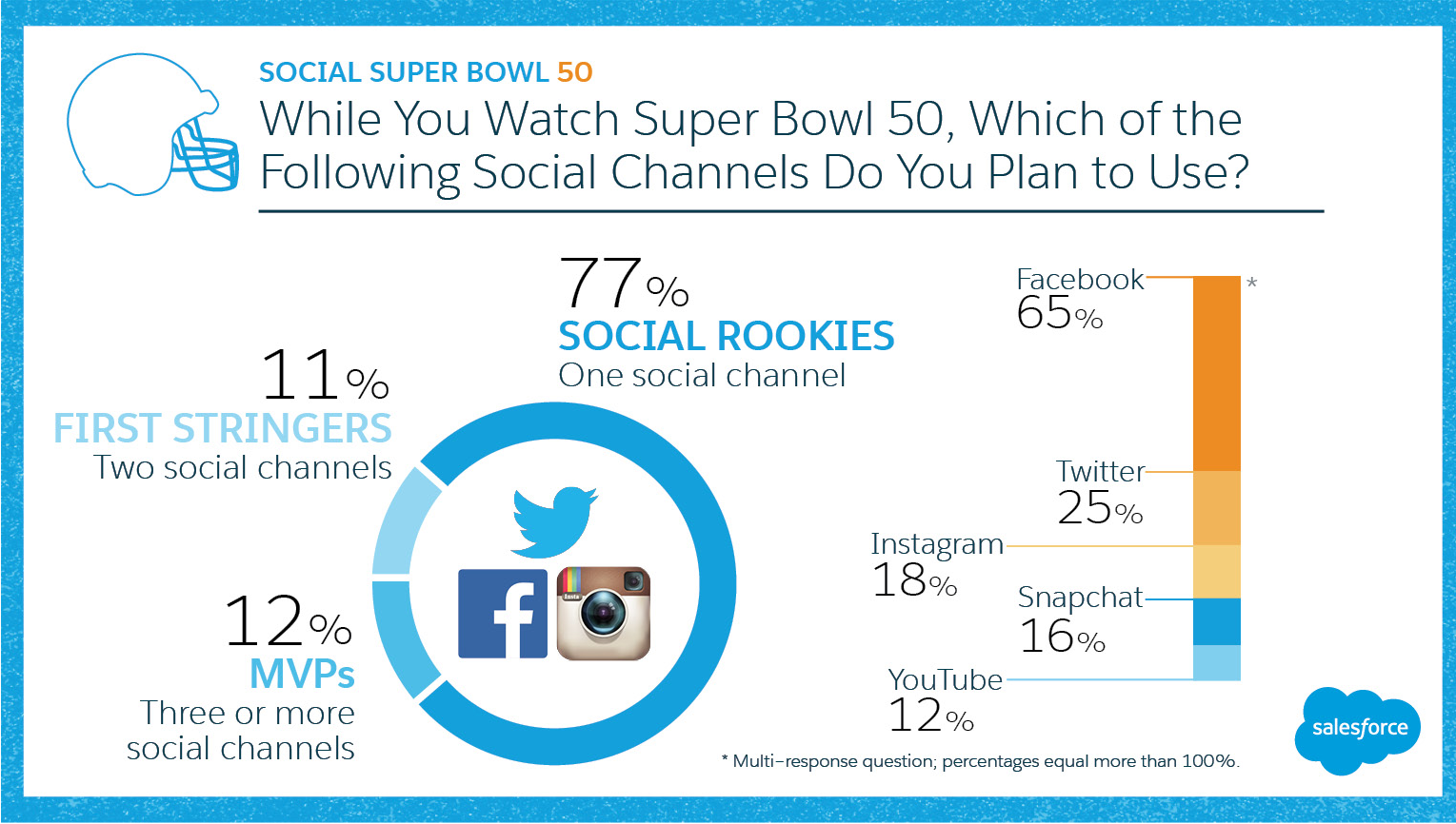 Twenty-three percent of those surveyed by Salesforce will use more than one social channel while the Denver Broncos take on the Carolina Panthers on Sunday. Salesforce Research surveyed 1,082 consumers and found that Super Bowl 50 viewers plan to use their devices and social media during the game. To plan your social media play for the Super Bowl, brands can look at targeting audiences with social media segments based on usage of social media channels.
