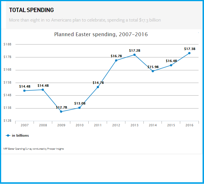 According to the annual Easter Spending Survey conducted by Prosper Insights and Analytics, the average US consumer is expected to spend USD 146 and the total spend for the holiday is expected to reach USD 17.3 billion. The planned expenses range from USD 5.5 billion on food, USD 3 billion on clothing and apparel, USD 2.7 billion on gifts, USD 2.4 billion on candy and USD 1.2 billion on flowers. The key activities quoted in the survey are visiting the family and friends (58 percent), going to a restaurant (16 percent) and cooking a family meal (56 percent). Children look forward to participating in an egg hunt (32 perecnt) and opening gifts.