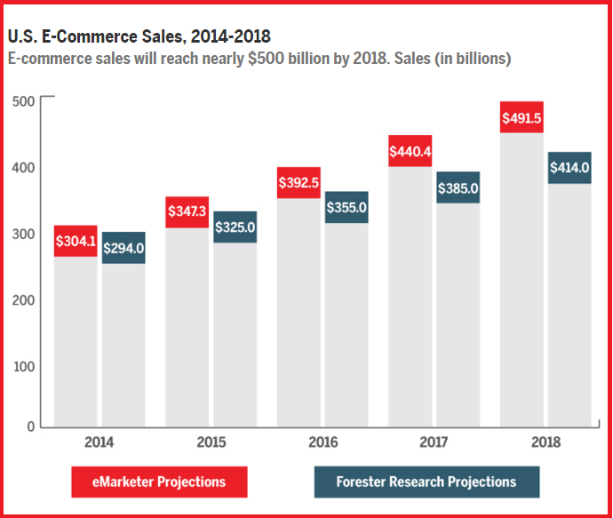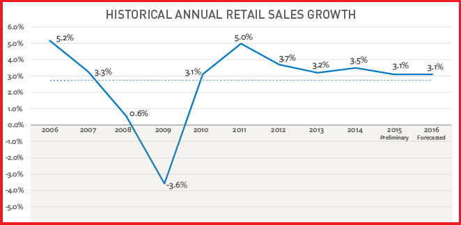 NRF forecasts that retail sales in 2016 will increase by 3.1 percent, from the average growth rate of 2.7 percent for the last ten years. Non-store sales in 2016 are likely to increase between 6 and 9 percent. US eCommerce Sales is likely to increase by 9-12 percent in 2016.