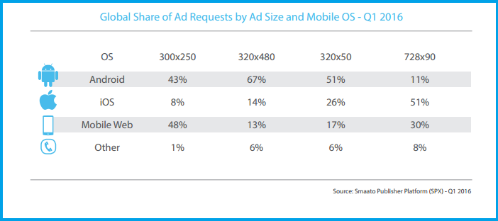 The Ad sizes popularity varies for different operating systems. For iOS leaderboard is the most popular ad format, followed by Medium Rectangle. For Android the most popular ad size is Interstitial followed by Medium rectangle.