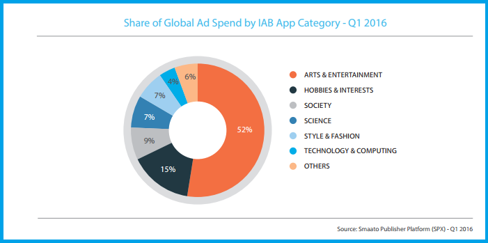 Mobile Advertising has over-indexed for growth in all categories including Music that makes for 59 percent of Mobile advertising revenue. Arts and Entertainment app makes for nearly half of Global ad spend for the apps.