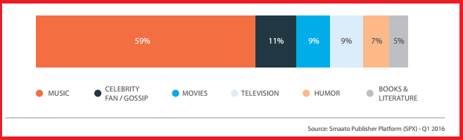 Music makes for a lion’s share of advertising revenue among other related content pertaining to the arts and entertainment category. Advertising revenue from Celebrity Gossip and Humor linked content contributes to nearly one-fifth of the Mobile Advertising revenue. Among different genres, celebrity gossip was seen popular with younger audiences, while books and literature appeals to a more mature audience.