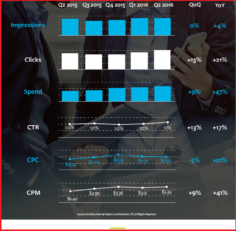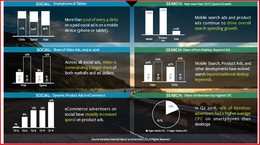 Advertisers spent 47 percent more year over year on social ads in the second quarter of 2016, as per a research study by Kenshoo. The study was carried out for campaigns with 550 billion impressions, 11 billion clicks across 20 categories for an estimated advertising spend of USD 6 billion spent during the last five quarters. Smartphones and tablets that are at 64 percent of the total spend make for 92 percent of all advertising spend. Smartphone advertising grew by 63 percent and product ads grew by 71 percent, leading to a total increase in search advertising spend of 10 percent year-over-year. Kenshoo’s study reinforces previous research showing that Facebook advertising makes search campaigns work harder. Adding Facebook Ads to search campaigns boosts campaign performance. Facebook ads are known to increase conversion rates and lower the cost of acquisition.
