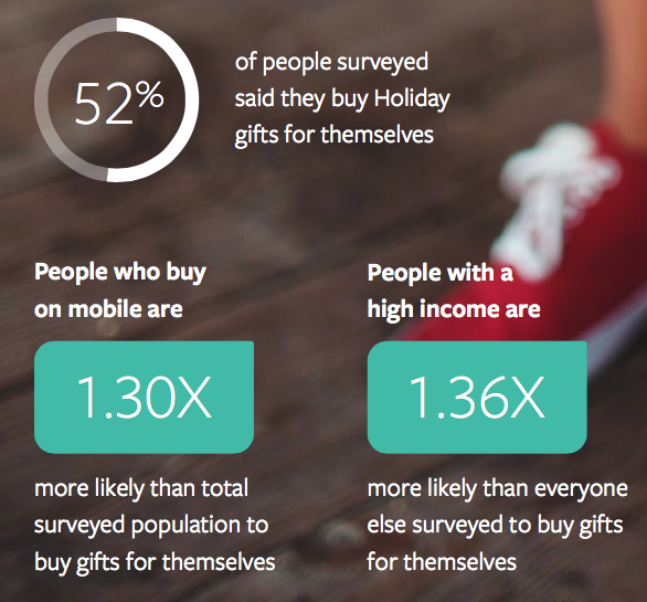 Self-Gifting is a trend that Brands need to factor in their plans with 52 percent buying gifts for themselves. Mobile shoppers and High Income Earners are more likely to gift themselves.