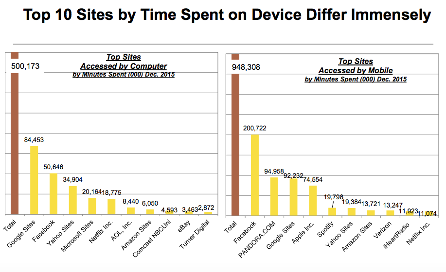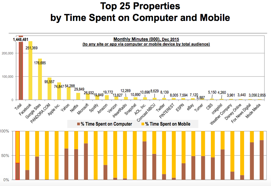 Facebook is the leading web property as per the comScore US Media Metrix Multi-platform research for December 2015. Google sites are the leading Go-to sites for Internet users on Computers. Nearly 70 percent of the time spent on Facebook is on Mobile.