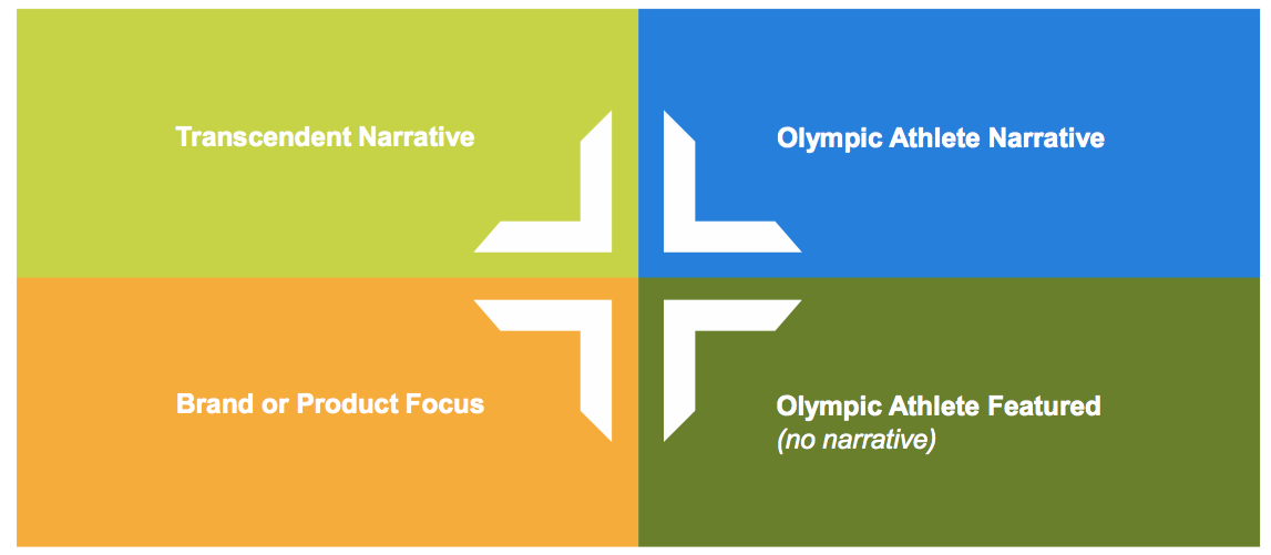 Olympic Athletes featured campaigns without a narrative, as seen in the case of Visa advertising, provides flexibility to advertisers to feature athletes in different moods or in an upbeat manner to create the engagement. Brand or Product Focus ads do not tailor the ads for the event. They rely upon consistent messaging to communicate and may take significant time to build on the relevance. Strong audience engagement comes from the personal relevance of the brand, emotional resonance or distinctiveness.